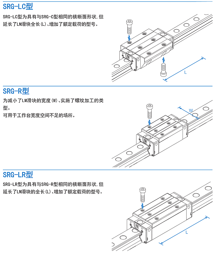 SRG型通过采用滚柱保持器,能获得低摩擦的平滑运动,是实现了长期运行而免维护的超高刚性滚柱导轨。