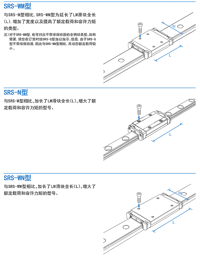 球保持器型LM滚动导轨SRS型采用在小体积的机身中装设2条滚动面的结构,可以承受各个方向的负荷;对于要求节省空间的部位、或者有力矩作用的部位等,可以只使用单轴。并且,使用球保持器可消除钢球之间的摩擦,因而实现了出色的高速性、低噪音、好音质、较长的使用寿命以及长期运行而免维护。